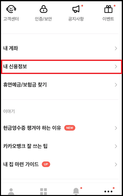 • 카카오뱅크 앱 실행 > 우측 하단 더보기 탭 > 내 신용정보 탭