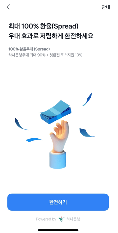 토스는 하나은행과 협업을 진행하며 하나은행에서 최대 90% 우대, 토스 APP을 이용해 첫 환전 시 10% 우대가 가능하여 여 100% 환율 우대가 가능합니다.