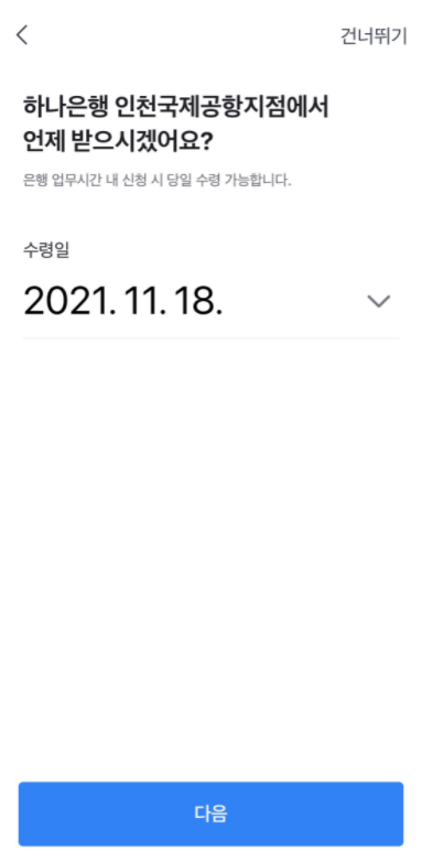 본인이 환전하고 싶은 금액 입력 후 외화를 어디서 받을지 선택하시면 됩니다. 환전금은 하나은행 지점에서 수령하셔야 하며 본인 거주지와 가까운 지점에서 수령받으시거나 거주지 근처에 하나은행 지점이 없다면 공항에 있는 하나은행 지점에서 수령받으셔도 관계없습니다.